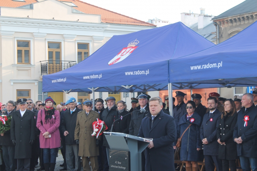 W czwartek  11 listopada  odbył się tu ceremoniał wojskowy , rozpoczęty złożeniem   przez dowódcę  Garnizonu Radom meldunku Wiceministrowi Obrony Narodowej Wojciechowi Skurkiewiczowi. W wypowiedzi  okolicznościowej W. Skurkiewicz  powiedział m.in. - Nieprzypadkowo od szeregu dni prowadzona jest akcja "Murem za polskim mundurem". To jest akcja wsparcia dla tych, którzy są na granicy, którzy zaraz mogą być na granicy, ale również dla ich rodzin. Zachęcam   do  wspierania  polskich żołnierzy, funkcjonariuszy straży granicznej, policji, gdyż oni na to zasługują. Służą  przecież Rzeczypospolitej, wypełniając słowa roty przysięgi.
